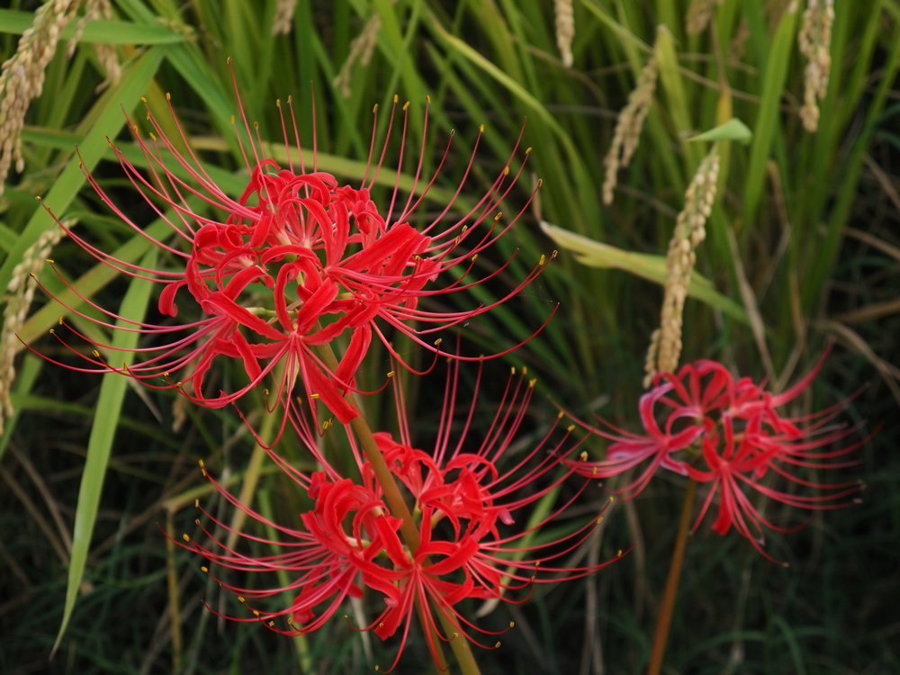 ピントは一番上の花に合わせました。右の彼岸花が適度にボケているのがわかります。後ろの稲穂も適度にボケています。