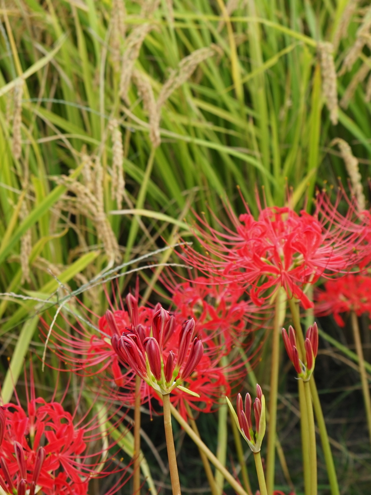 手前のつぼみの彼岸花にピントを合わせて撮影。これも後ろの彼岸花や稲穂が適度にボケています。