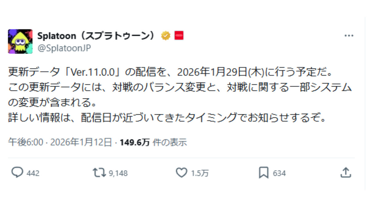 Frosty Festが終わった1月12日の18時に突如、スプラトゥーンの公式ツイッターで「Ver.11.0.0」のアップデートの予告がされました。