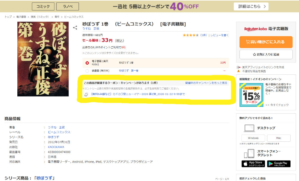 こういう極端に値段の安いセールはkindleでしか行われない印象ですが、このセールは楽天koboでも行われています。ビームコミックスがKADOKAWAだからだと思います。kindleでカドカワ系のマンガが極端に安い値段で売られているときは、楽天koboでも同様のセールが行われていることが多いです。