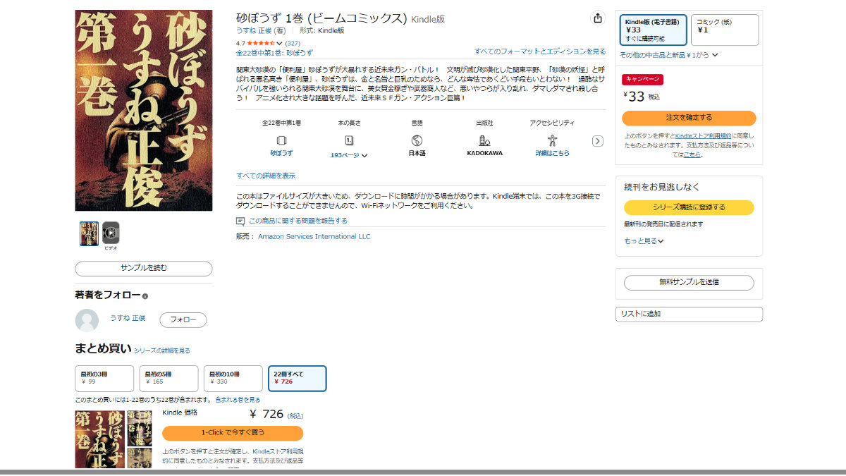 「砂ぼうず」は全22巻なので、全巻買っても726円という破格の安さです。全巻同じ値段というのは購入する側としてもとてもありがたいです。